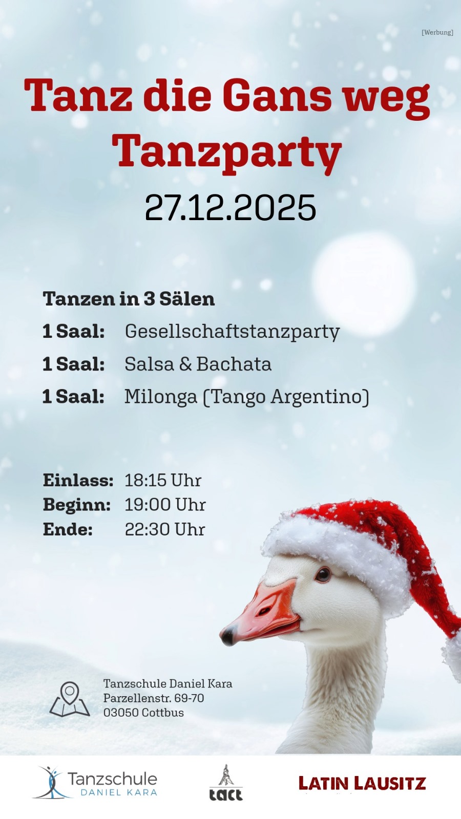 Tanz die Gans weg – die Salsa-Weihnachtsparty! Wir feiern in der Tanzschule Kara und tanzen auf 3 Tanzflächen! Hier könnt ihr euer Tiket buchen: https://www.tanzschule-daniel-kara.de/veranstaltungen/tanz-die-gans-weg/